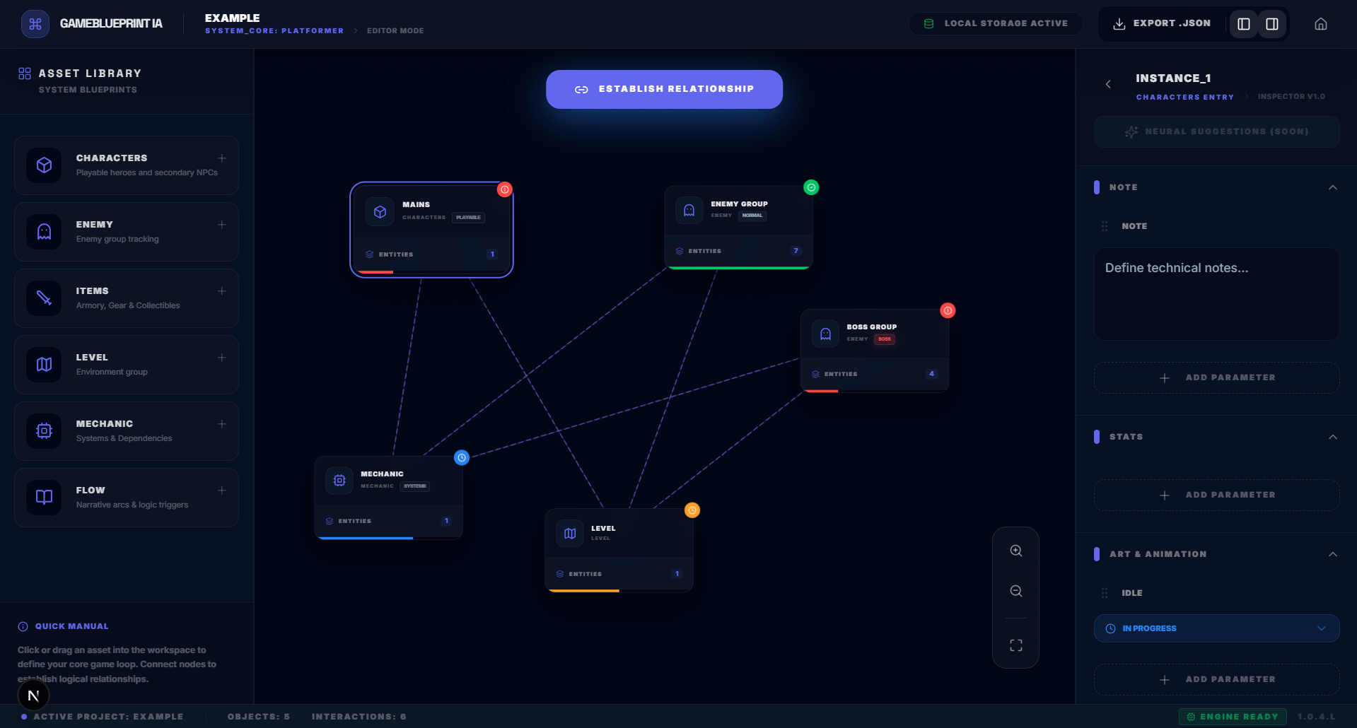 Instead of writing a messy Google Doc or filling a blank template, you build your Game Design Document by connecting specialized nodes: Characters, Enemies, Items, Levels, Mechanics, Flow, and more. Each node has its own inspector with fields for stats, art & animation notes, technical parameters, and descriptions.